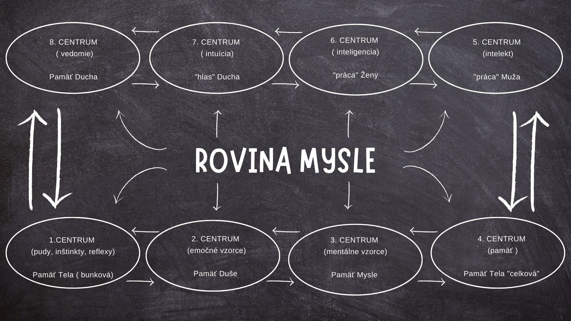 Ak má ženská stránka Ega svojich základných osem centier, tak pre vyváženie je potrebné, aby nimi "dominoval" aj mužský princíp v človeku. Muž ako reprezentant Mysle a myslenia má za úlohu pochopiť, ako jeho Myseľ funguje a naučiť sa ju ovládať = používať konštruktívne. Pre lepšie pochopenie, bude rovina Mysle_nia rozdelená do základných ôsmych centier z ktorých každé bude mať pridelené číslo.