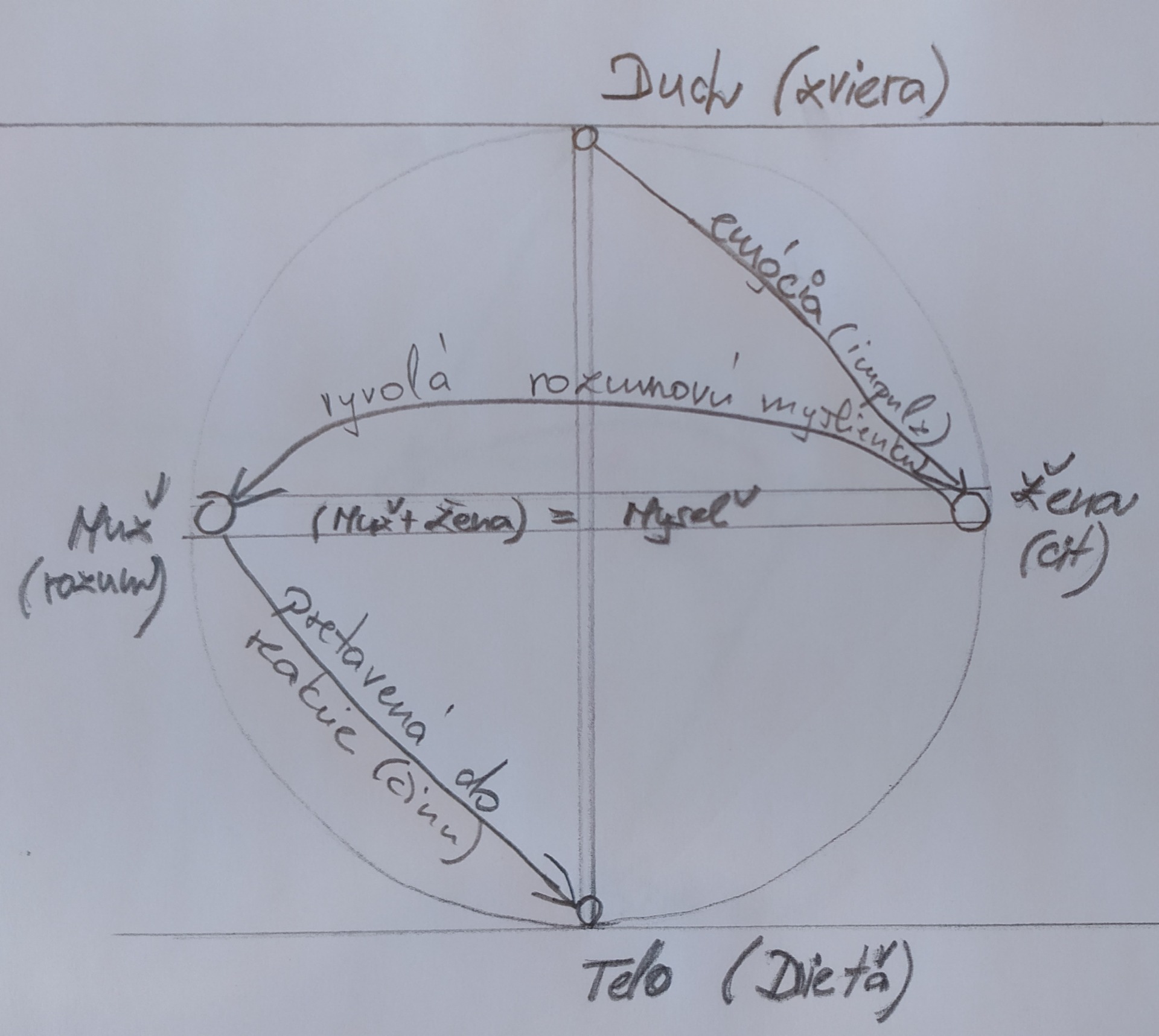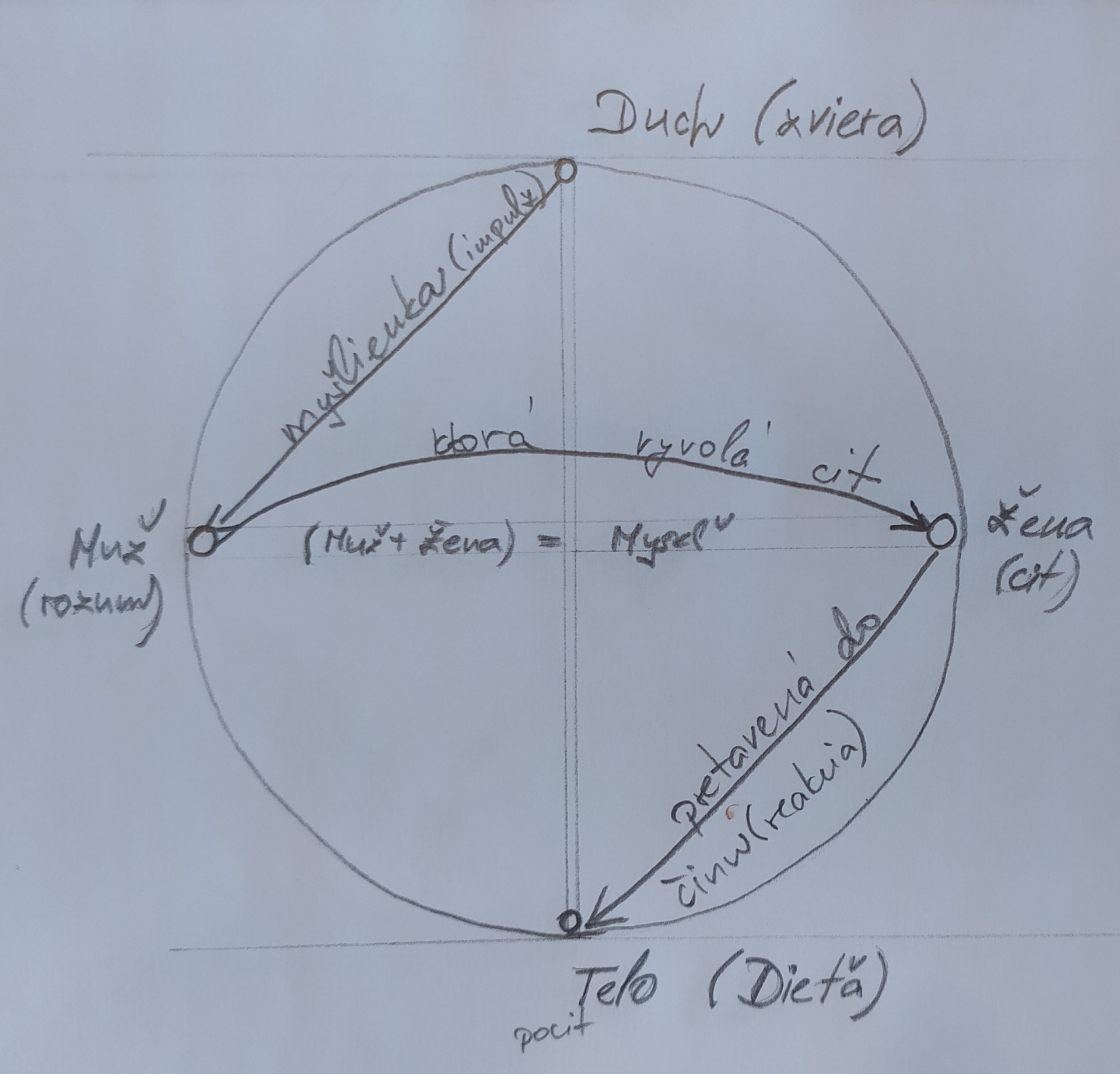 Ženskému princípu fungujúcemu na princípe Duše/emócií. Tu sa "vytvorí" alebo skôr priradí emócia a je z toho pocit, následná reakcia a čin v hmote (aj slovo je čin/konanie). Čím ďalej od seba je Muž a Žena tým