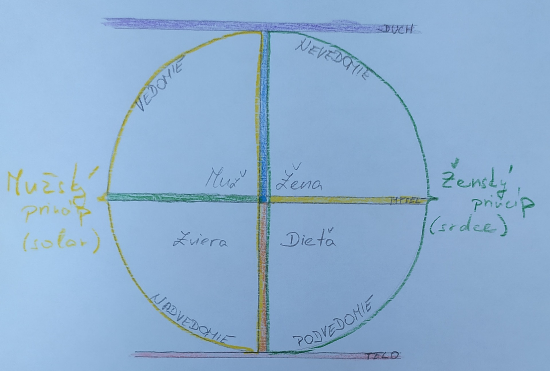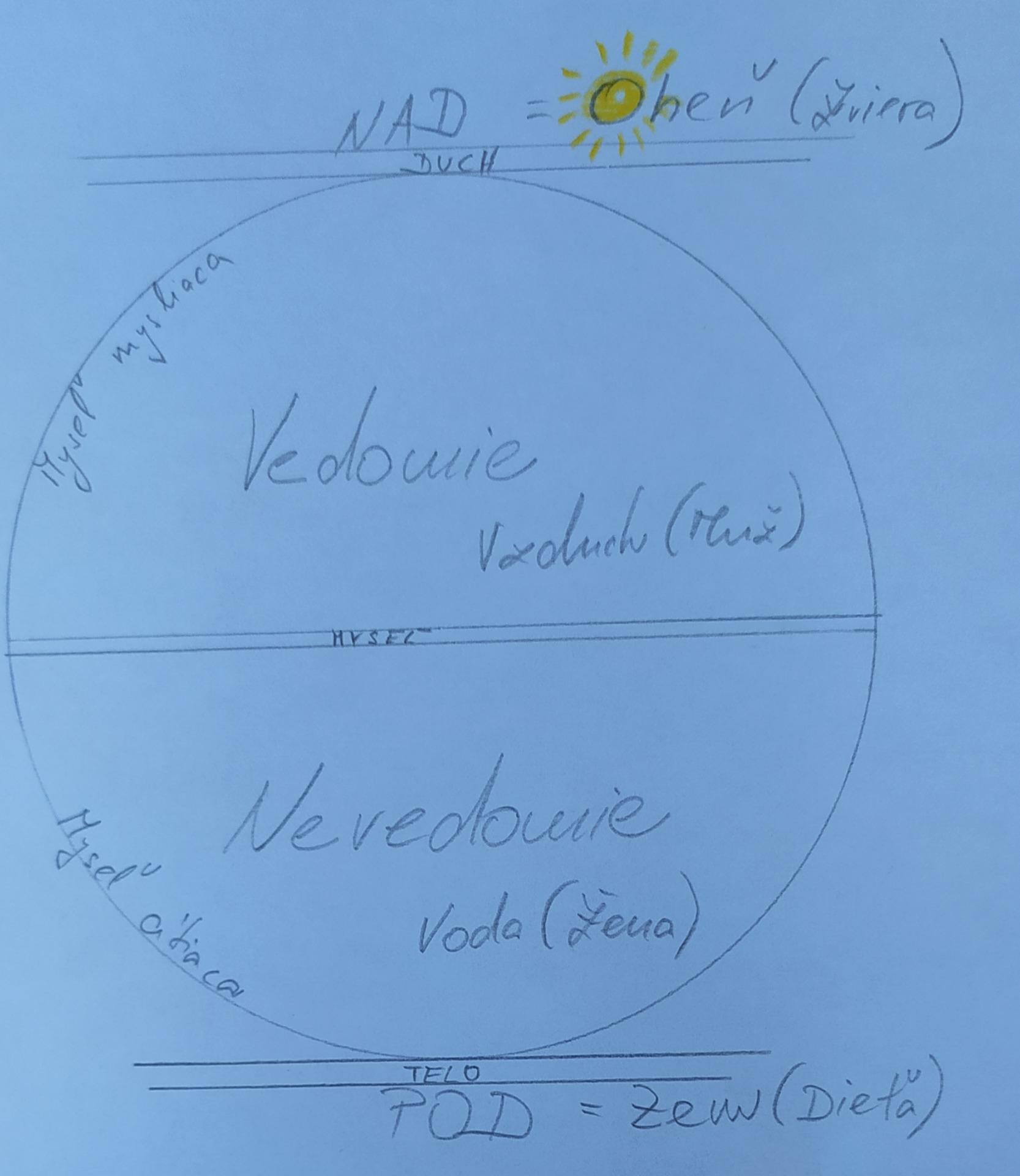 NAD = biela (svetlo), POD = čierna (zem), (ne)vedomie = šedá/ priesvitná (vlhký vzduch)